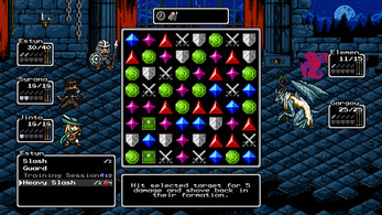 Guide your party through the forbidden castle, gathering equipment and items to bolster their strength! Encounter enemies and battle them in 16-bit JRPG style combat, but with gems! Gain levels and have your party members learn new abilities! Choose your path through written events with outcomes that affect your party! Get handy pro-tips from the in-game manual! Make choices that create useful synergies, so you can reach the end and slay the wyvern!